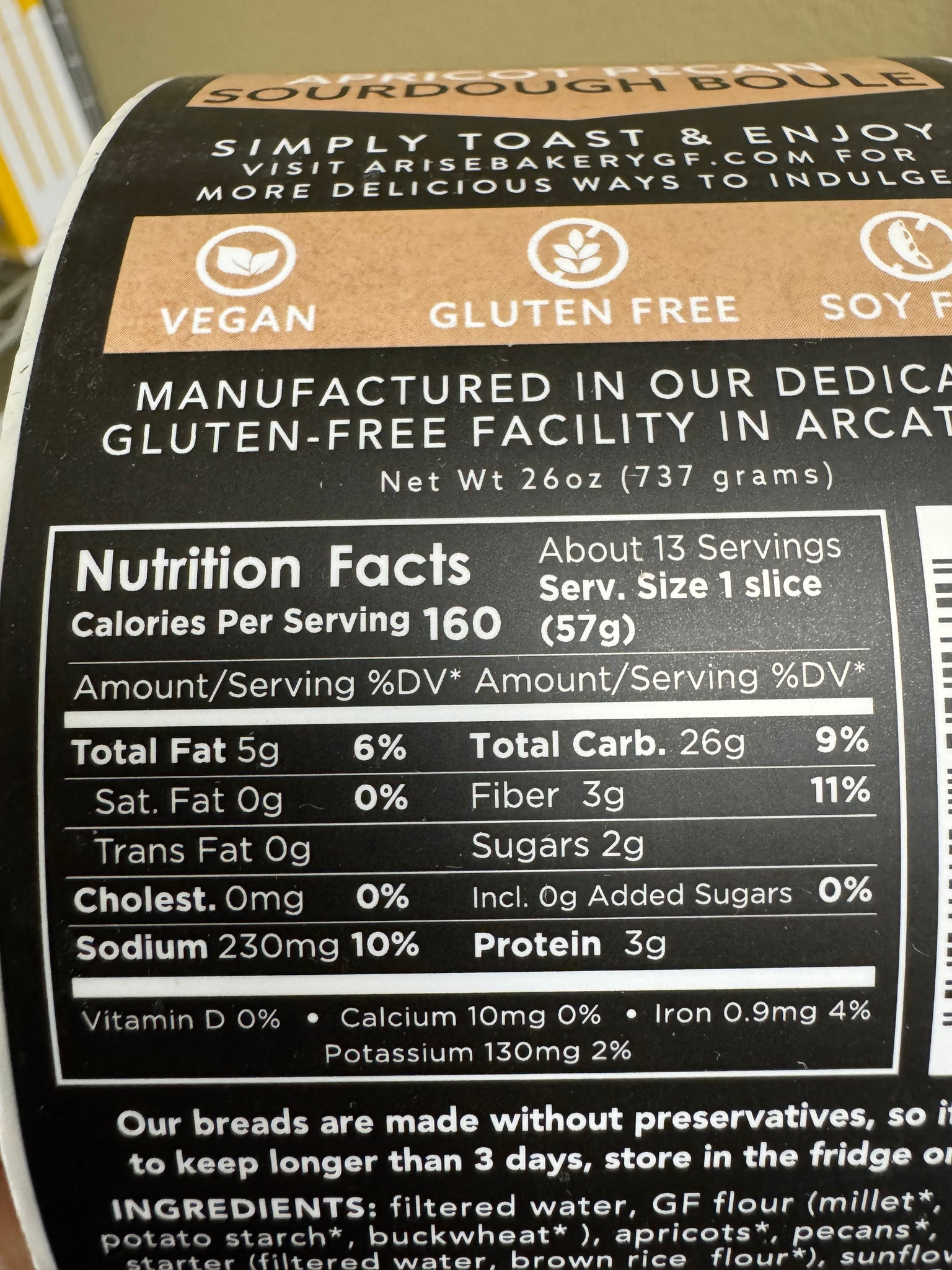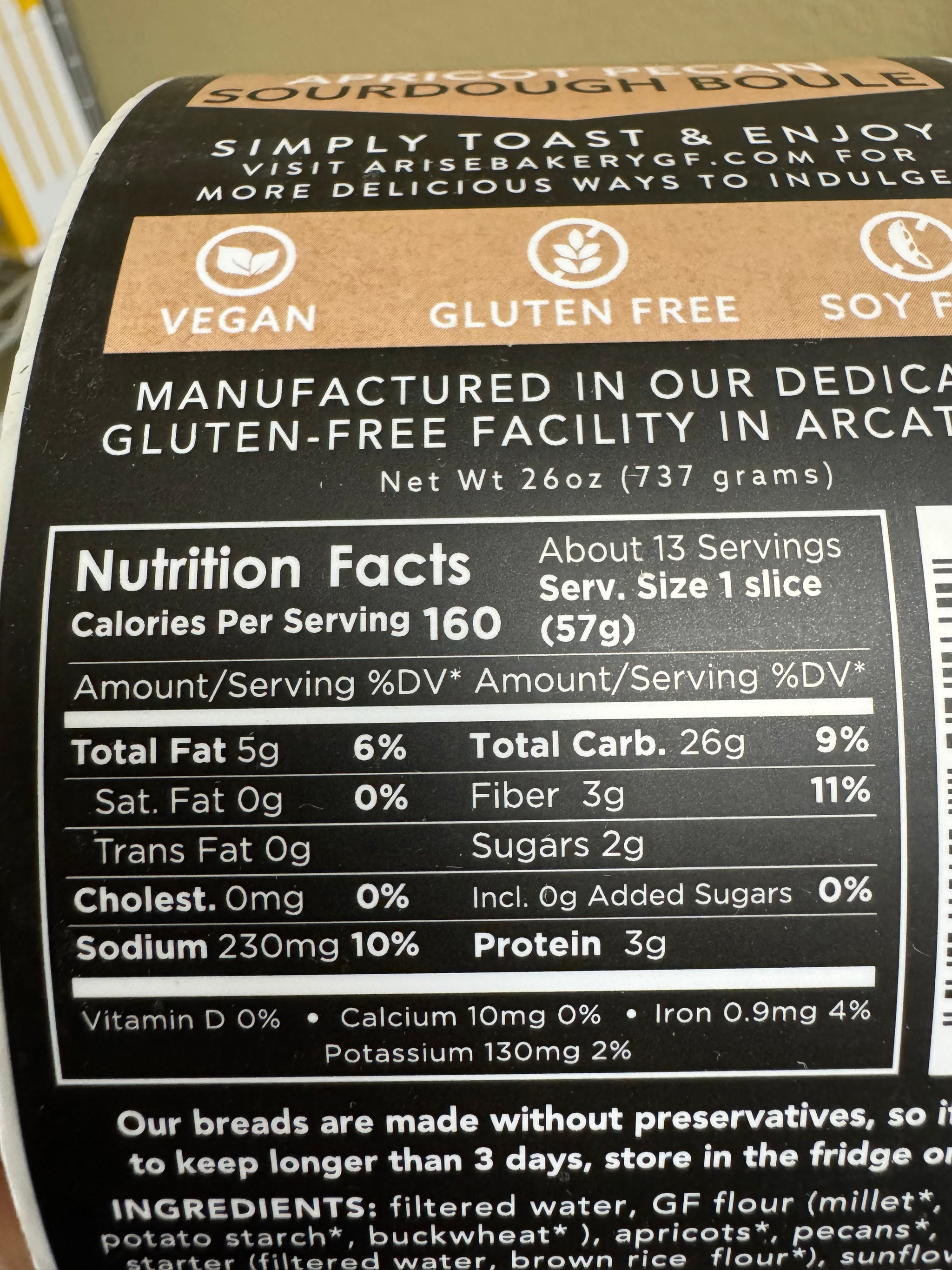 Ingredients: Filtered water, GF flour (millet*, tapioca*, potato starch*, buckwheat* ), apricots*, pecans*, wild yeast starter (filtered water, brown rice flour*), flax meal*, sunflower seed meal*, psyllium husk*, salt. *Organic ingredients